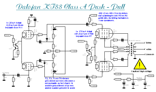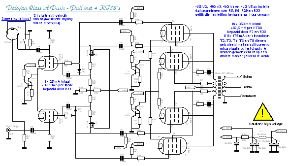 To make things easy I started at the outputstage going backwards to the input. The power I needed was about 25 Watt which is a problem if you are looking for a single ended amplifier. That is why this is a push pull amplifier. I think the KT88 tube is the best one if it comes to distortion at this power level.