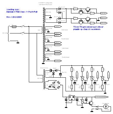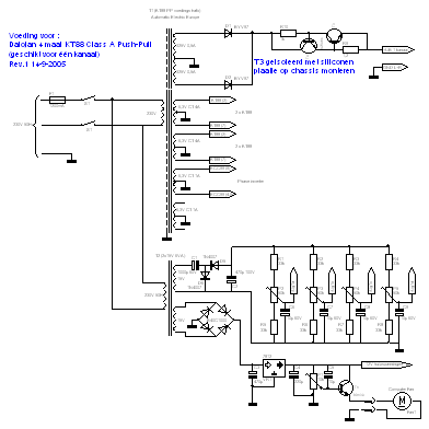 Eigenlijk dezelfde eindtrap maar dan met 4 KT88's per kanaal. Dit vergt op diverse plaatsen natuurlijk wel wat aanpassing. Denk maar aan het dubbele vermogen dat geleverd wordt aan de uitgang. Een dikkere uitgangstrafo met een lagere Raa is dus noodzakelijk, maar ook het dubbele aan vermogen wat uit de voeding moet komen. Dat laatste is het eenvoudigst te realiseren door per kanaal dezelfde 'standaard AE-europe' voedingstrafo te gebruiken. Wel moet de smoorspoel geschikt zijn voor de dubbele stroom, let hier goed op bij de aanschaf van deze spoel. Als je een te kleine smoorspoel gebruikt en de kern komt in verzadiging dan blijft er niets over van de zelfinducte en kan de wikkeling (te)heet worden. Dit kan leiden tot crematie van de spoel. Op deze droevige manier willen we tog geen afstand doen van wat eens een mooie smoorspoel was. Ook de elco's in de voeding zullen flink groter moeten worden om de rimpelspanning binnen aanvaardbare waarden te houden. Aangezien ik een current limmit in de voedig gebruik moet ook die aangepast worden aan de nieuwe situatie. De current limit is niet echt noodzakelijk maar als er onverhoopt in of rond de eindbuizen een keer sluiting zal optreden (of zelf gemaakt worden) dan zal de uitgangstrafo niet spontaan afscheid van ons nemen. Okee dat was dan een kleine toelichting op het wel en wee van de aangepaste voeding. En nu het schema . . .
