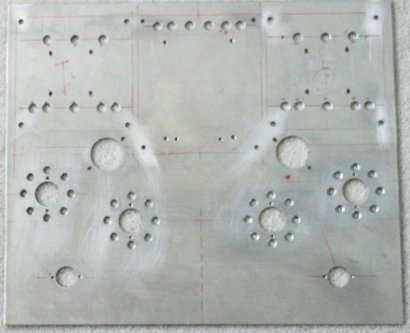 Uiteindelijk worden dan de gaten afgetekend en geboord. De gaten voor de buisvoeten en de voedingselco's heb ik geboord en met een trappenboor. Het werkje is behoorlijk tijdrovend maar leverd wel een prima resultaat op. Als alle gaten geboord zijn wordt de plaat ontvet met een beetje aceton en daarna ontdaan van alle bramen. Als laatste komt er een schuurblokje en een velletje schuurpapier 400 aan te pas om het oppervlak echt mooi vlak te maken en iets op te ruwen voor de hechting van de verf. Na het schuren goed schoonmaken en ontvetten. Daarna een heel dunne laag filler, eigenlijk alleen om een hechtlaag te vormen voor de volgende verflagen. De eerste dunne laag ongeveer 20 minuten laten drogen en daarna dekkende laag filler op de plaat spuiten. Zorg er wel voor dat de plaat goed horizontaal ligt zodat er weinig kans is dat 'zakkers' ontstaan. Deze laag tenminste een uur laten drogen! Hij moet echt goed droog en uitgehard zijn voordat de kleurlaag gespoten kan worden. De kleurlaag in meerdere dunne lagen spuiten en tussendoor wel de minimale droogtijd toepassen. Haast is hier de ondergang van het gedane werk omdat de kans groot is dat je dan weer van voor af aan kan beginnen nadat je de plaat weer helemaal verfvrij hebt gemaakt. Ik weet uit ervaring dat dit een aanslag op het goede humeur is. Rest nog een paar lagen blanke lak voor de glans en de duurzaamheid. Hiervoor geld natuurlijk het zelfde als voor de kleurlagen. Haast is een slechte compagnon. Zo dat zit er dan op. We hebben nu een chassisplaat die er fantasties uitziet. Laat hem desnoods een paar dagen uitharden om hem daarna even in de autowas te zetten, dan wordt hij wat minder snel vuil. Het geeft wel een mooi glanzend resultaat, maar ik kan vaak het geduld niet opbrengen.