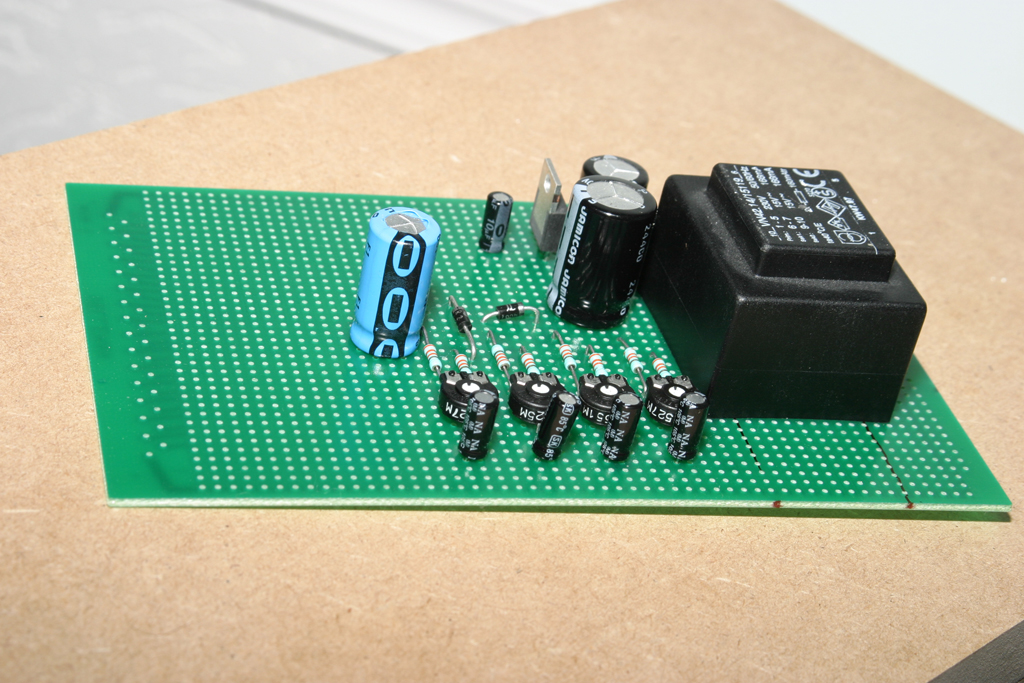 Ik hun een paar bandkern transformatoren voor deze versterker laten wikkelen. Tevens hebben ze ook de buizen en voedings elco's geleverd samen met wat klein materiaal en de aluminium chassisplaat. Verder zijn veel weerstanden en de diodes van Conrad afkomstig, net als de bedradingsbordjes en de gaatjesprint. De bouten, moeren, ringen e.d. zijn geleverd door de plaatselijke metaalwaren handelaar. En om de zaak wat kleur naar wens te geven is de autoshop met een bezoek vereerd. Deze heeft mij een spuitbus filler, spuitbus kleurlak en een spuitbus blanke lak verkocht. En niet te vergeten MDF sokkel die perfect op maat gezaagd is door een zeer gewaardeerde kennis/collega. Overigens had hij die waardering al verdiend lang voor het zagen van de sokkel. Verder is bijna alle signaal voerende bedrading uitgevoerd in verzilverd draad met 'Tefal' (Teflon) isolatie en sommige in puur zilver. De resterende bedrading is uitgevoerd in standaard montage snoer of de uit Kimber speaker kabel ontlede aders. Voor het opwekken van het vaste negatief en een 12Volt hulpspanning voor de zwartwerkers en om de wind er onder te houden is een klein trafotje van 2 x 15 V 0,25A gebruikt.