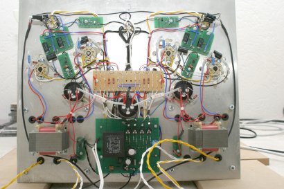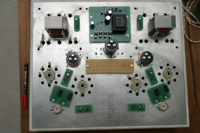 Hierbij zetten we alle buizen exact in de gelijke richting wat gewoon mooier uitziet als een paar graden verdraaid ten opzichte van elkaar. Eclo's in de beugels monteren en daarna alles vastdraaien. Nu kunnen we alles vast voor de show op de sokkel zetten en de buizen er even in om alvast te kunnen zien wat het gaat worden. Nu weer terug naar de werklijkheid, er moet nog immers veel gebeuren. Eerst de voedingstrafo er op monteren. Ik heb eerst met wat moeite in de montage gaten waar de bouten door moeten rubber tules gestopt zodat de trafo in rubbers is 'opgehangen'. Dit loont de moeite omdat eventuele trillingen dan toch wat worden gedempt voordat deze de kans hebben om de hele versterker mee te laten trillen. Deze actie zorgt er voor dat het geheel mechanisch nauwlijks geluid maakt. Een konstante brom uit de versterker kast is niet echt fijn om naar te luisteren! De bouten en moeren waarmee de trafo gemonteerd word dus niet al te strak aandraaien, maar net zo strak dat er geen speling meer is als de zaak in de normale stand staat. Daarna heb ik de smoorspoelen gemonteerd en de printjes met 'zwartwerkers'. Hierbij is het van groot belang om de isolatie plaatjes (siliconen) niet te vergeten en te kontroleren of er echt geen sluiting is. Lichten we hier de hand mee, dan tracteren we ons op een heftig probleem als de spanning er op gaat.