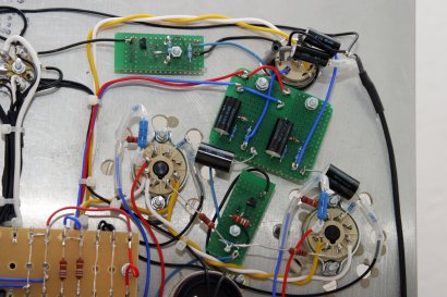 Nu kan aangevangen worden met de eerste bedrading. Ik doe het liefst eerst de gloeidraad circuits. Hiervoor heb ik aders uit Kimber luidspreker kabel gebruikt, deze is redelijk stug en laat zich dus makelijk in de gewenste banen leggen. En blijft daar dan ook. Daarna de bedrading van de voeding, daar waag ik geen Kimber kabel aan in verband met de isolatie eigenschappen. Het zal misschien wel goed gaan maar ik durf het niet aan, stel je voor dat na enige tijd spontaan ergens doorslag optreed. Met wat pech heb je dan een 'leuk' klusje op te knappen. Voor mij dus verzilverde kabel met teflon isolatie. Ook geleverd door de AE-Europa uit Schagen. Daarna de losse componenten er in solderen en we zien dan de Finish in zicht komen.
